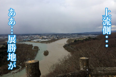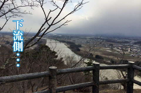 余談/柵から向こうは真下に道路と北上川。腰ひき気味に写真撮ってます。